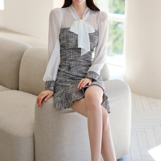 ブルーツイードジャケット+ノースリーブワンピースセットアップ
