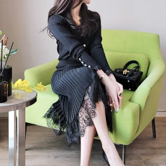 Vネックフリルニットトップ+ニットスカートセットアップ