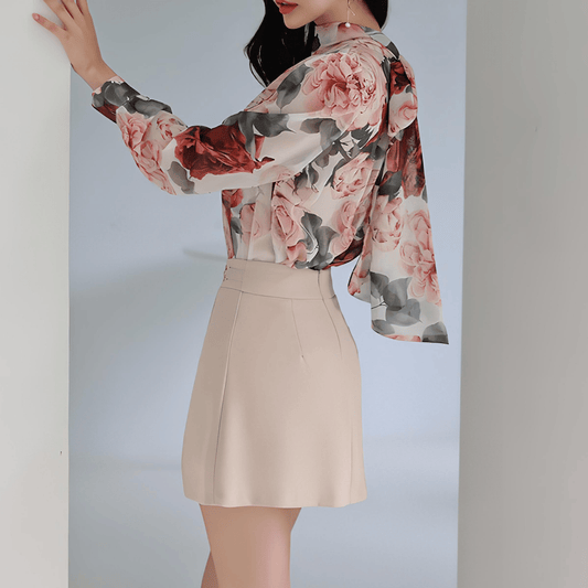 Vネックシャツ+ハイウエストショートスカートセットアップ