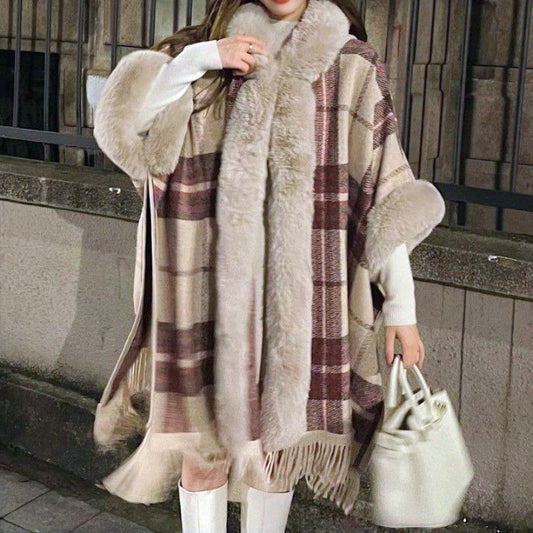 セールチェック柄タッセルショールマント