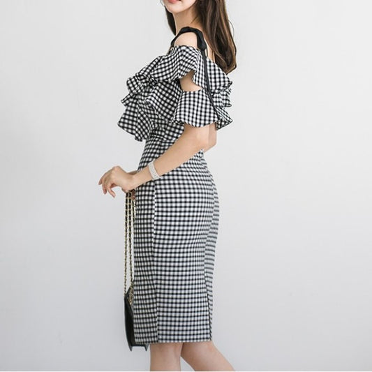オフショルダーフリルミディ丈ワンピース
