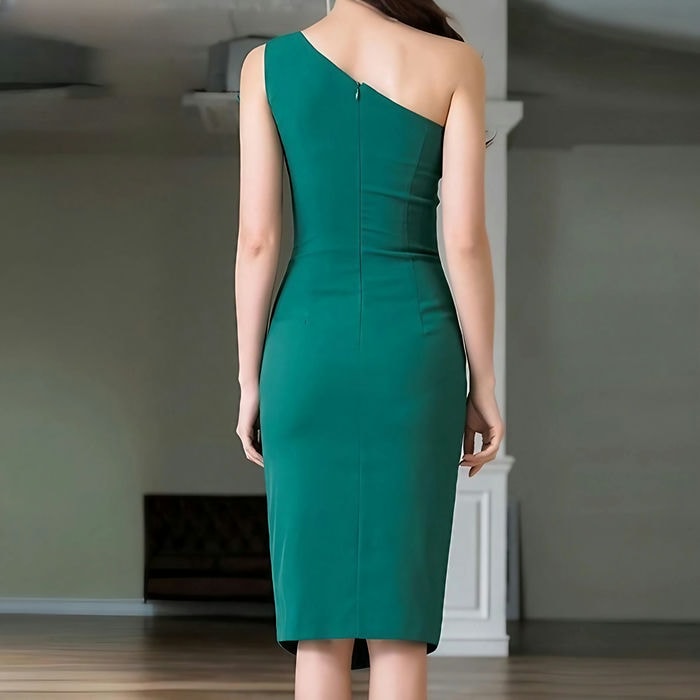 シングルショルダーとフリルのデザインがエレガントな雰囲気を演出するワンピース