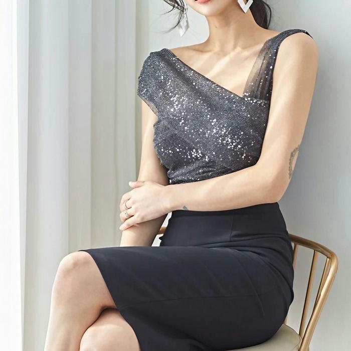 透け感のあるメッシュ素材にスパンコールが施され、エレガントさを演出するオフショルワンピース