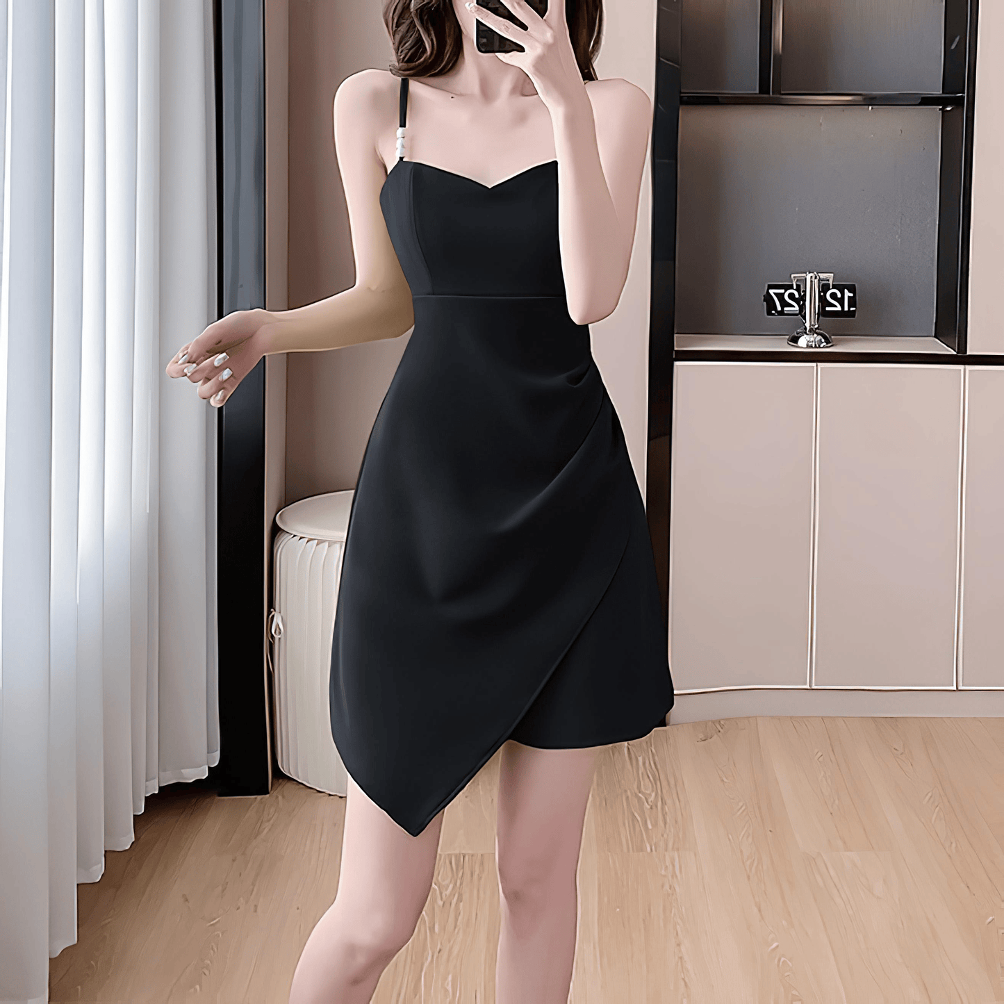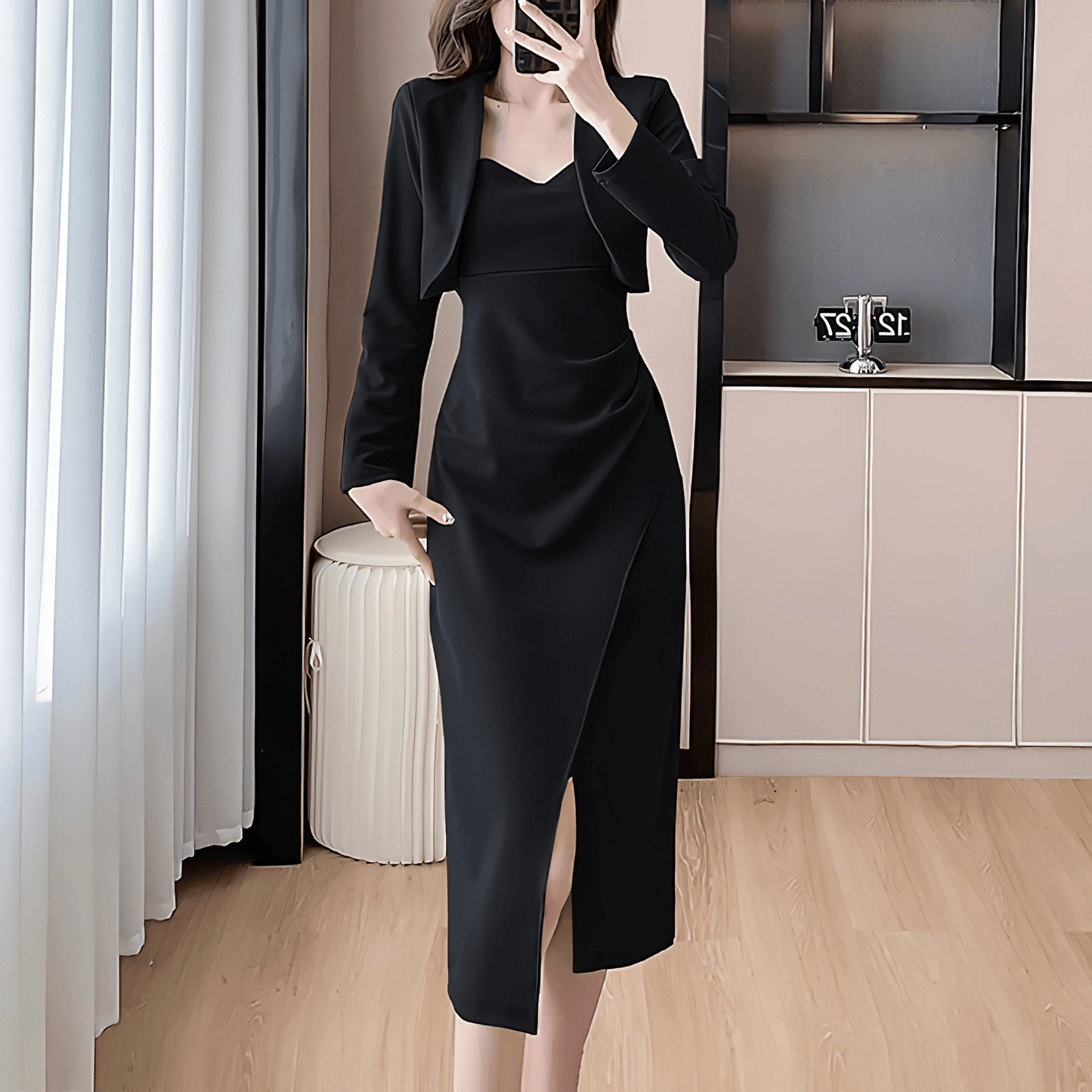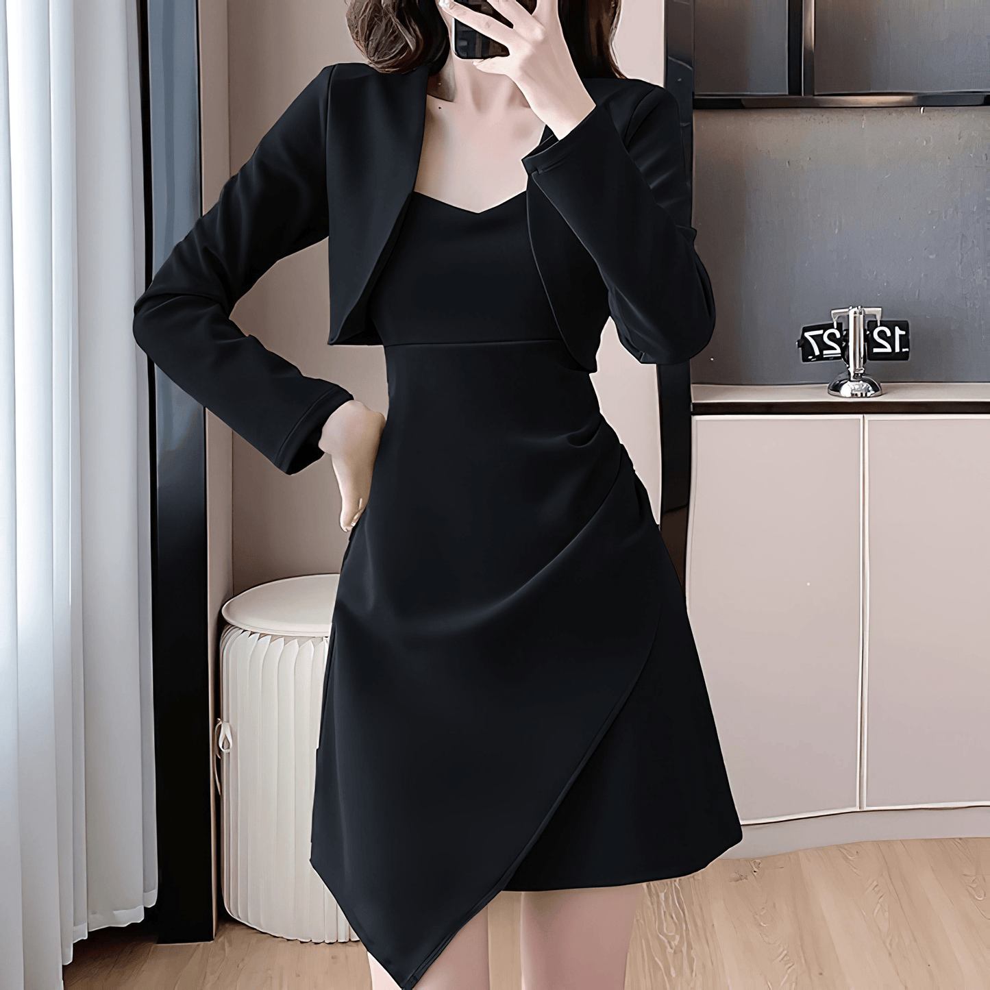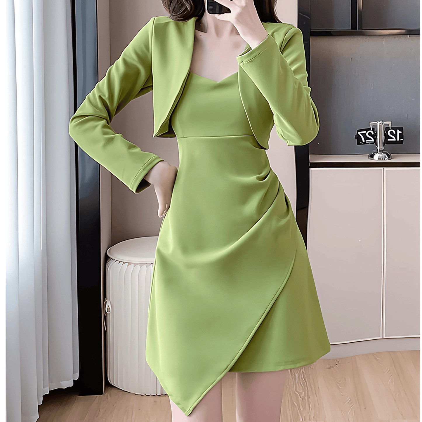 エレガントで高級感あふれるジャケットと、アシンメトリーな裾が目を引くキャミソールワンピースの組み合わせが、スタイルを華やかに彩ります。 パールのアクセントがさらにリッチな印象を与え、カジュアルからフォーマルまで、さまざまな場面で活躍する一着です。 グリーンとブラックの選べるカラーと、スカート丈もお選びいただけます。