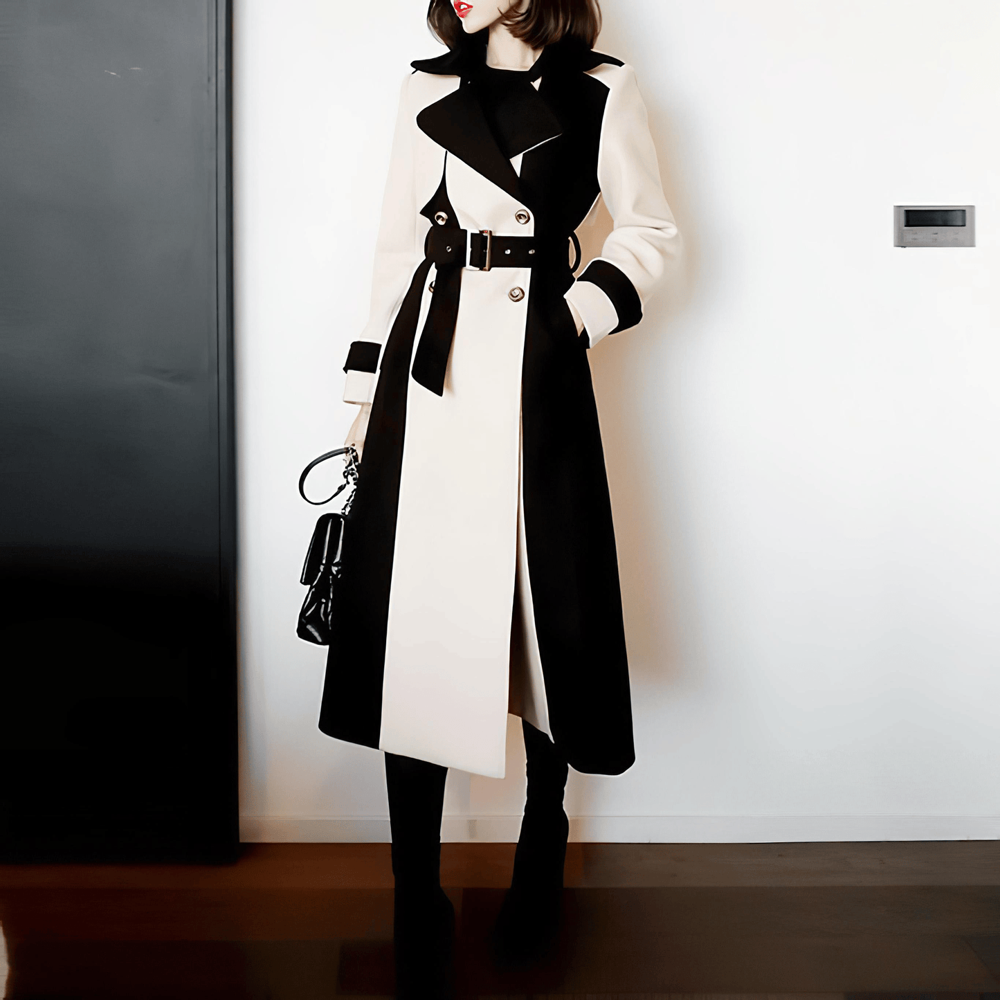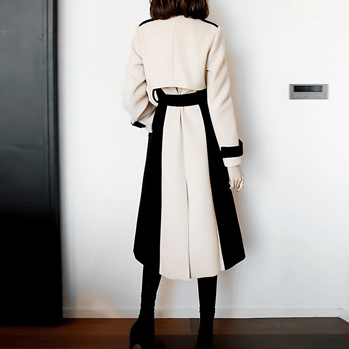 スタイルを引き締めるウエストベルト付きデザインと、印象的なカラーコントラストが洗練された雰囲気を演出。シルエットを美しく引き立てるフィット感があり、特別なイベントから日常のコーディネートまで幅広く活躍します。 シンプルでありながら、ディテールにこだわった一着です。