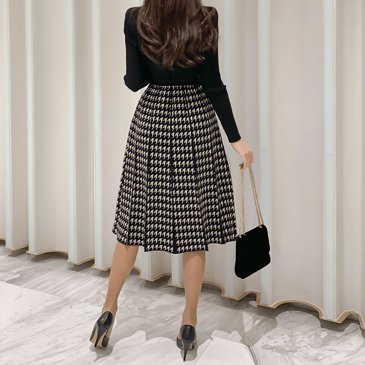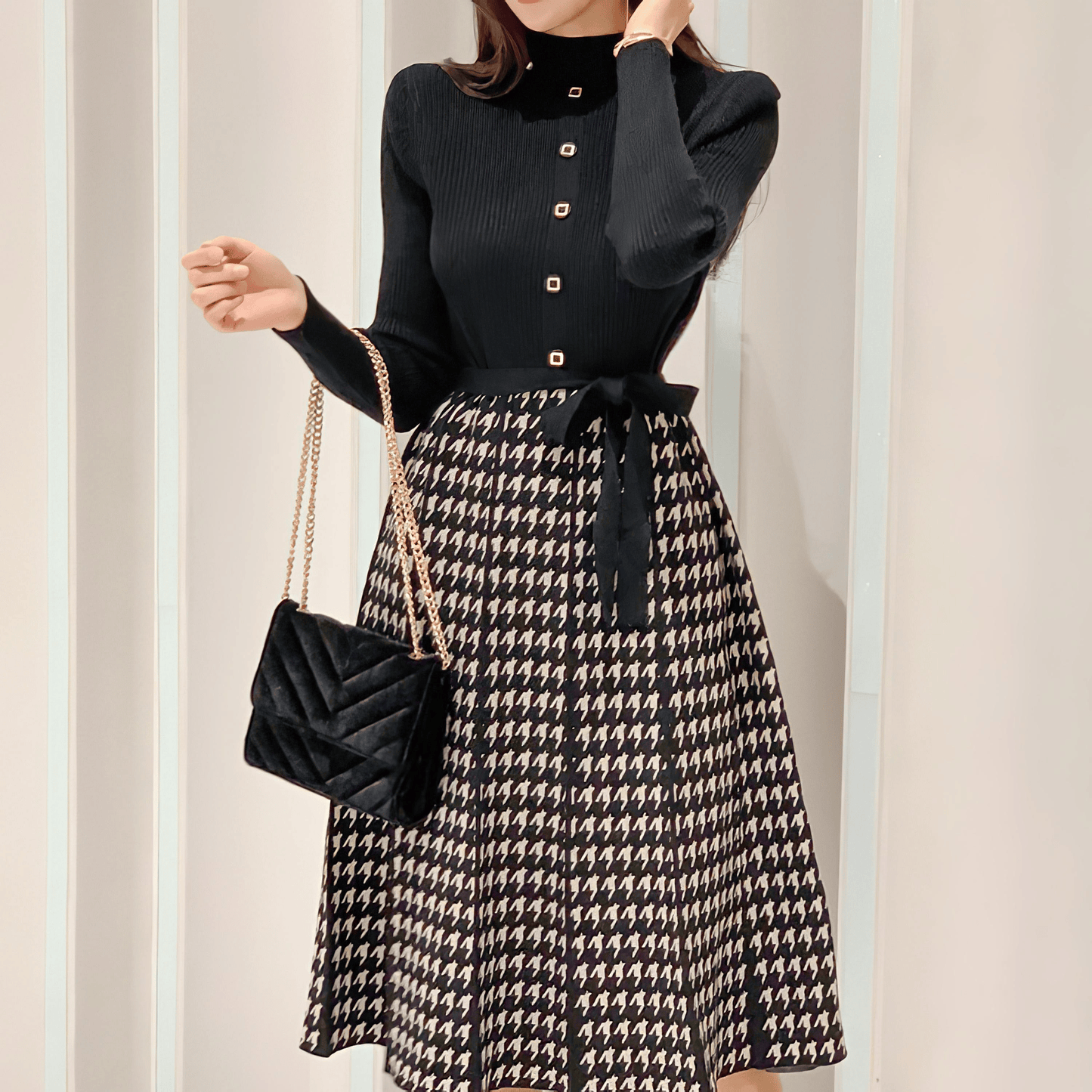 クラシックな千鳥格子模様とハイネックデザインがエレガントな雰囲気を演出し、ウエストのリボンがスタイルアップを叶えます。 広がりのあるフレアスカートは、歩くたびに軽やかに揺れ、華やかさをプラス。 デイリースタイルからフォーマルなシーンまで幅広く対応できる、エレガントさと快適さを兼ね備えたワンピースです。