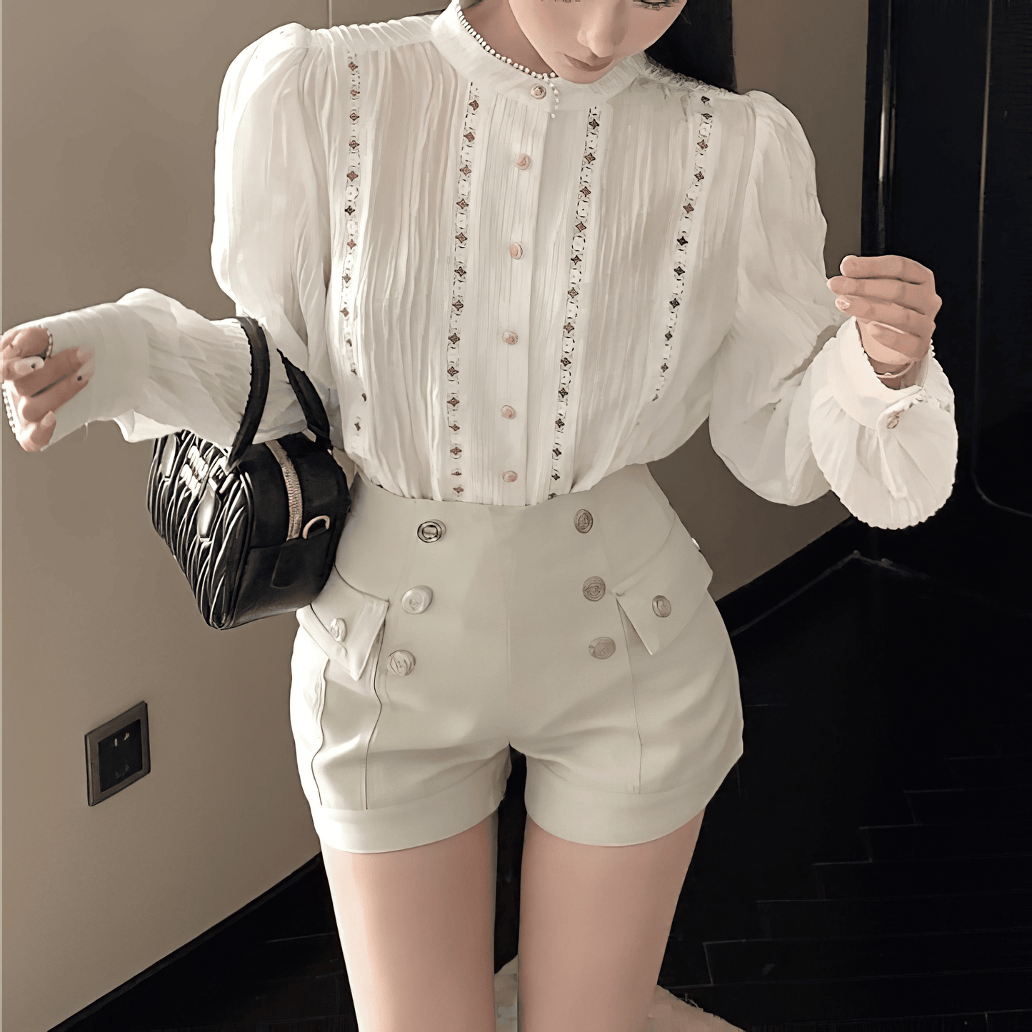 繊細な刺繍と透かし模様が施された上品なブラウス