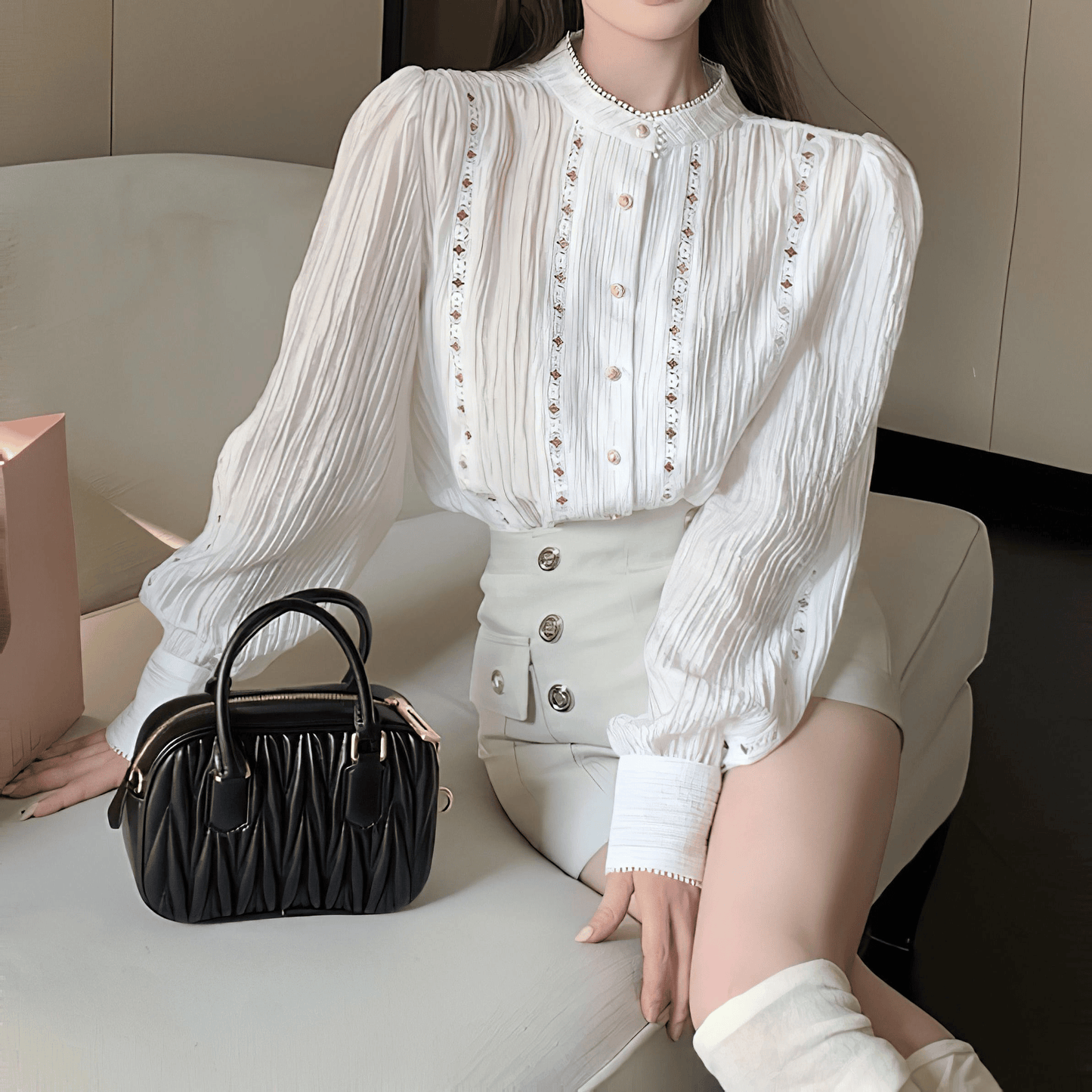 清楚な白色が清潔感を醸し出し、立ち襟とボタンディテールがクラシカルな印象を与えます。 特徴的なランタンスリーブはふんわりとしたボリューム感で、女性らしい柔らかさを表現しつつ、袖口がしっかりとフィットすることで美しいシルエットをキープします。 オフィスシーンはもちろん、デートやフォーマルな場にも対応可能な一着で、シーンを選ばず品のあるスタイルを楽しめます。