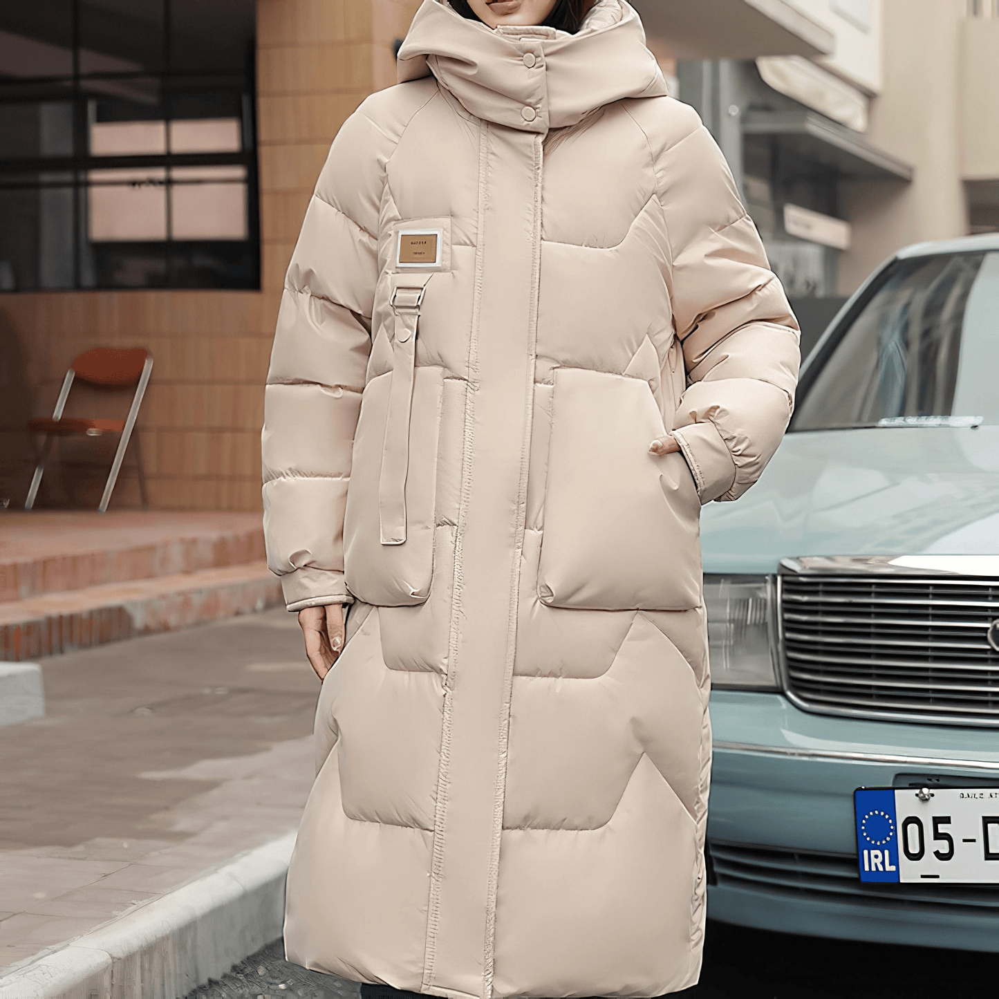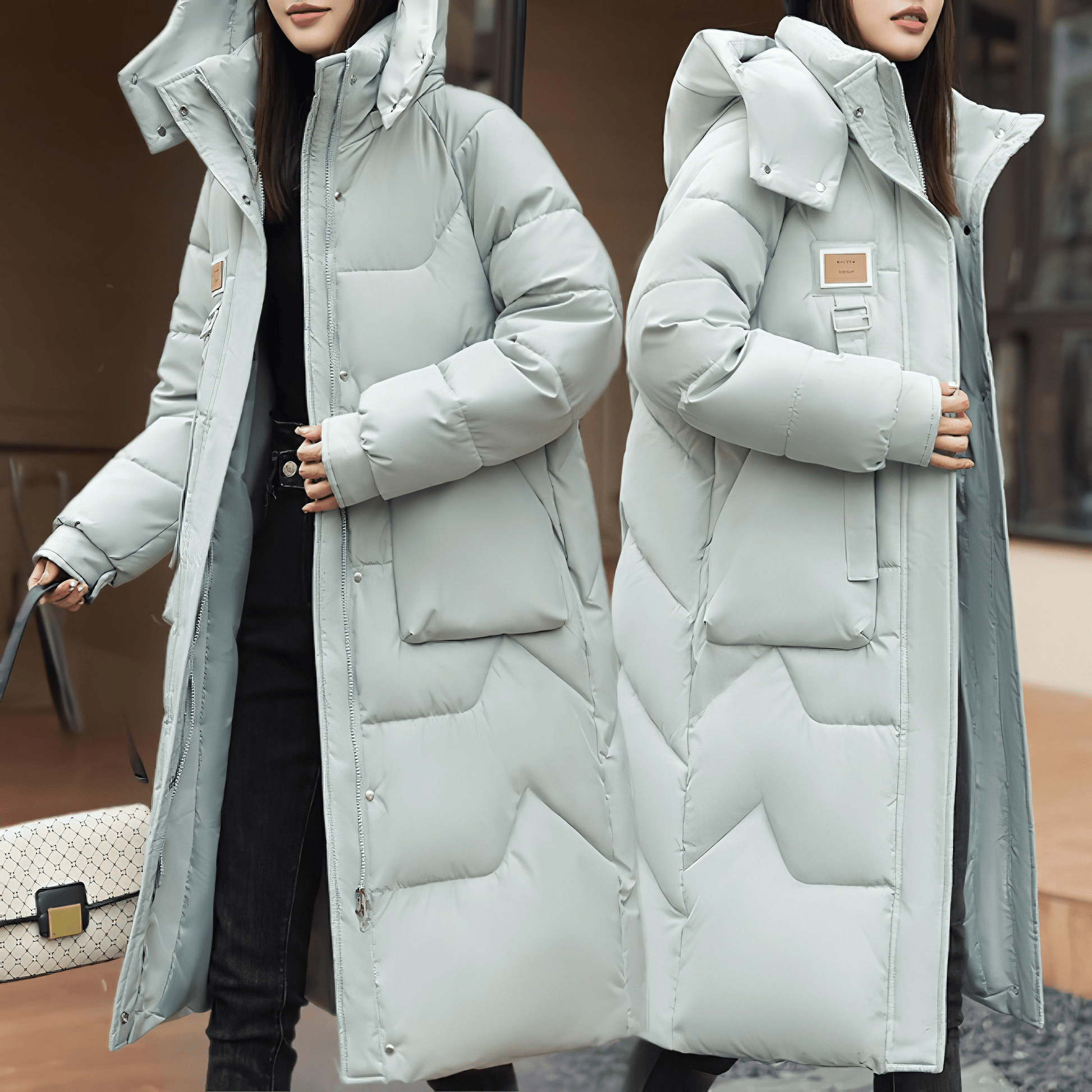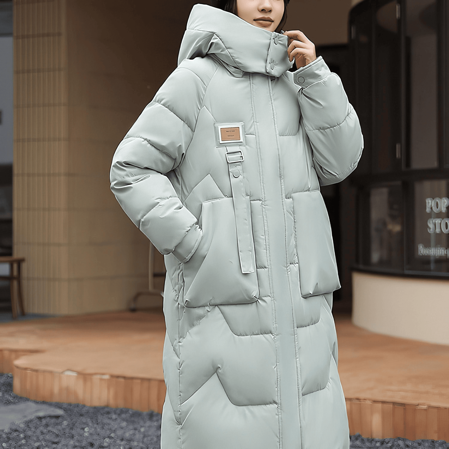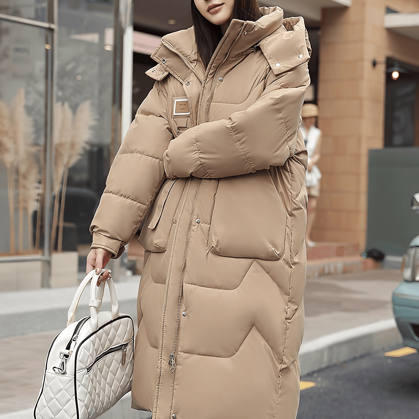 冬の寒さをしっかりガードする、シンプルで上品なロングダウンコート