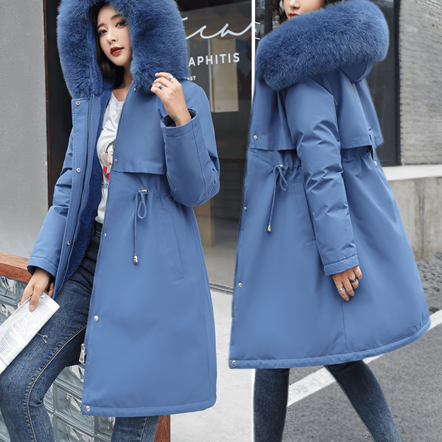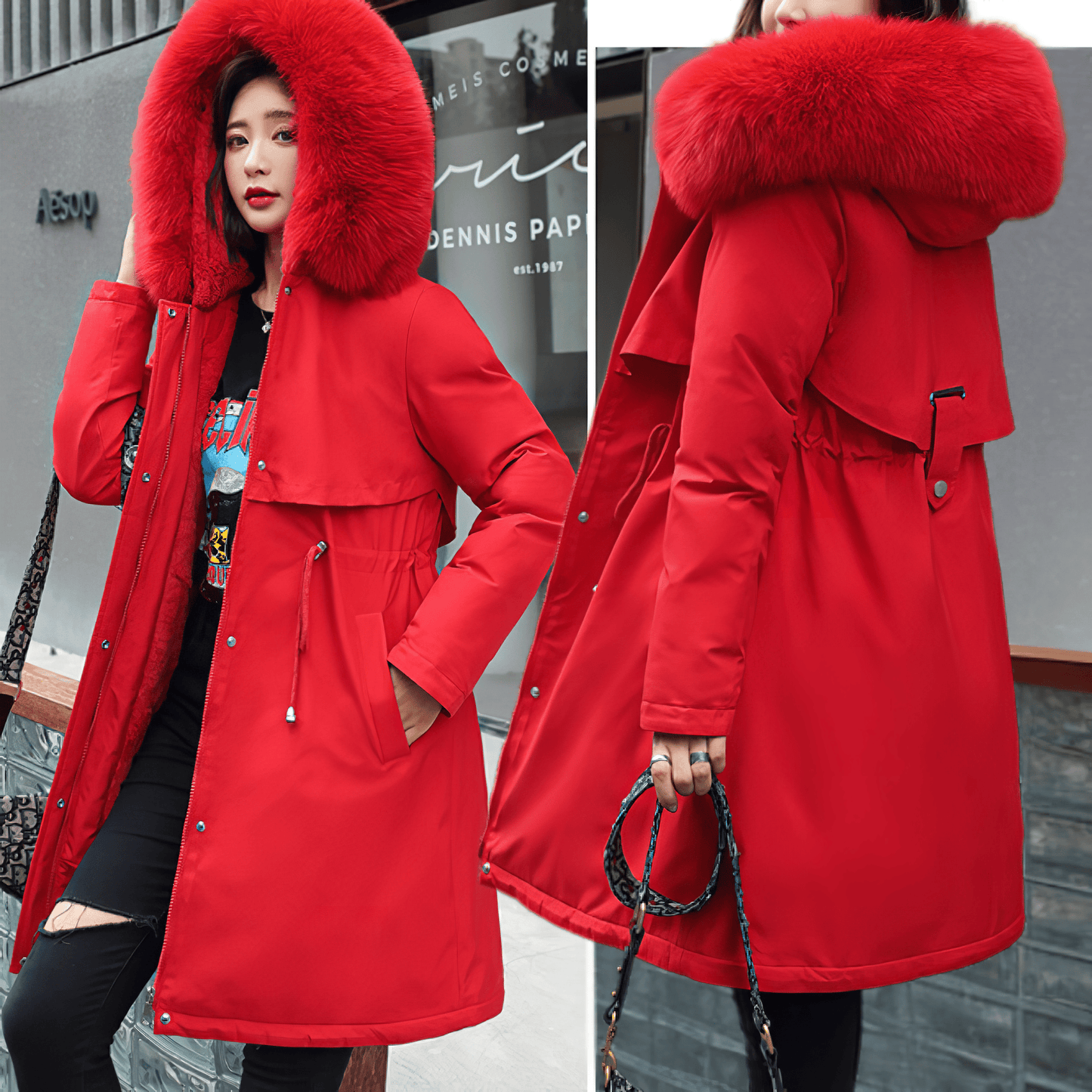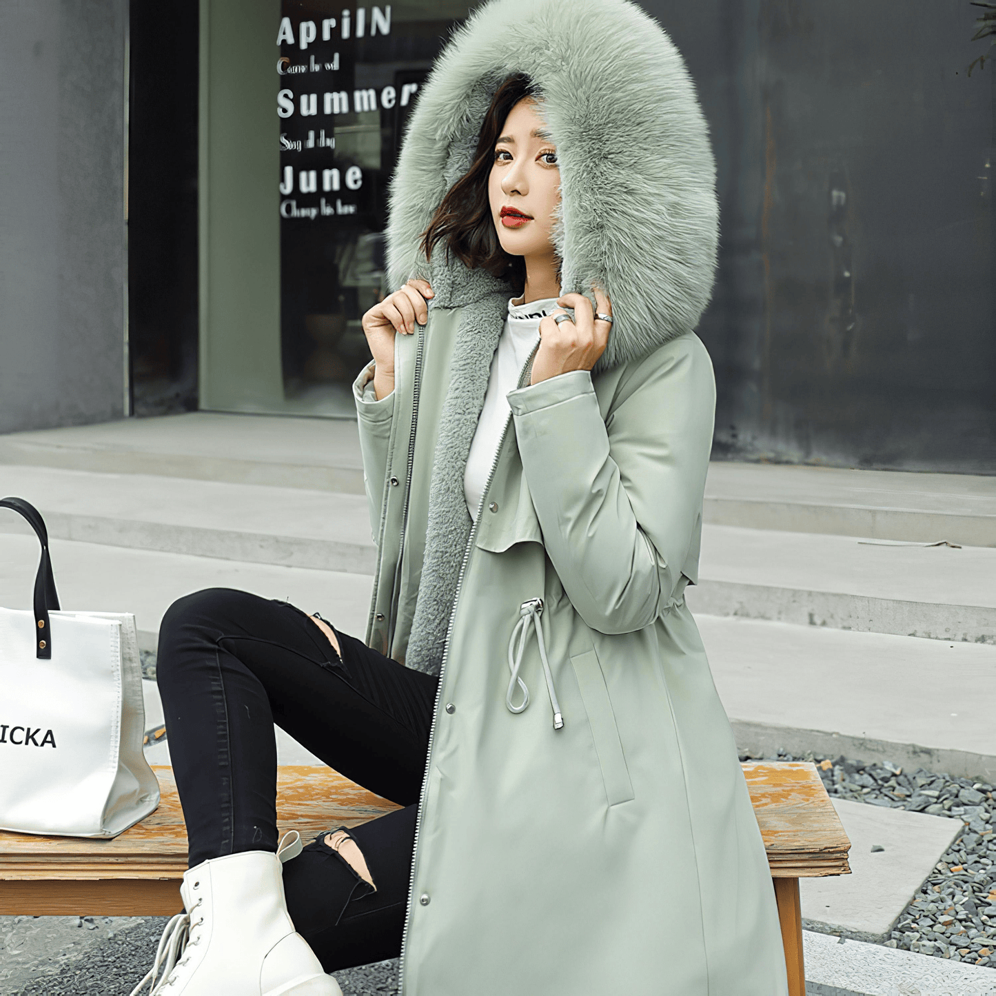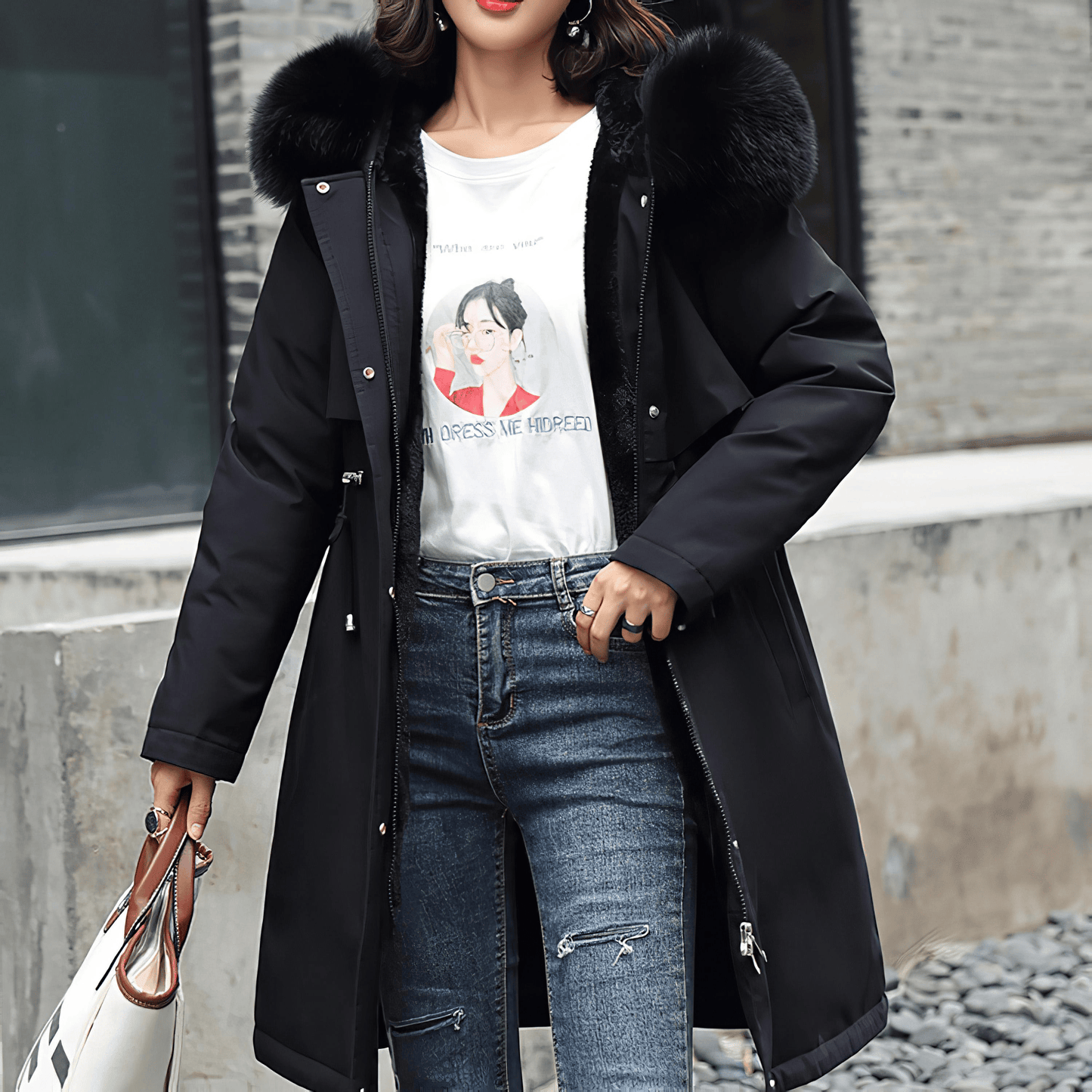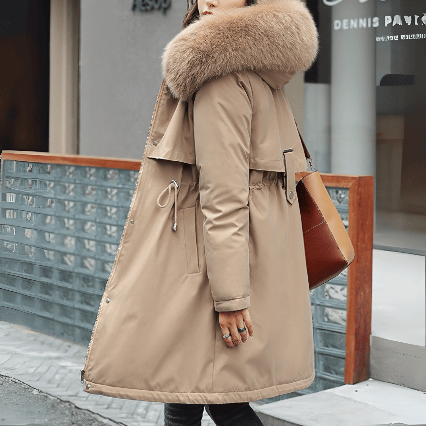 エレガンスと温かさを両立させた必需品、ファーフード付きミディアムダウンコート