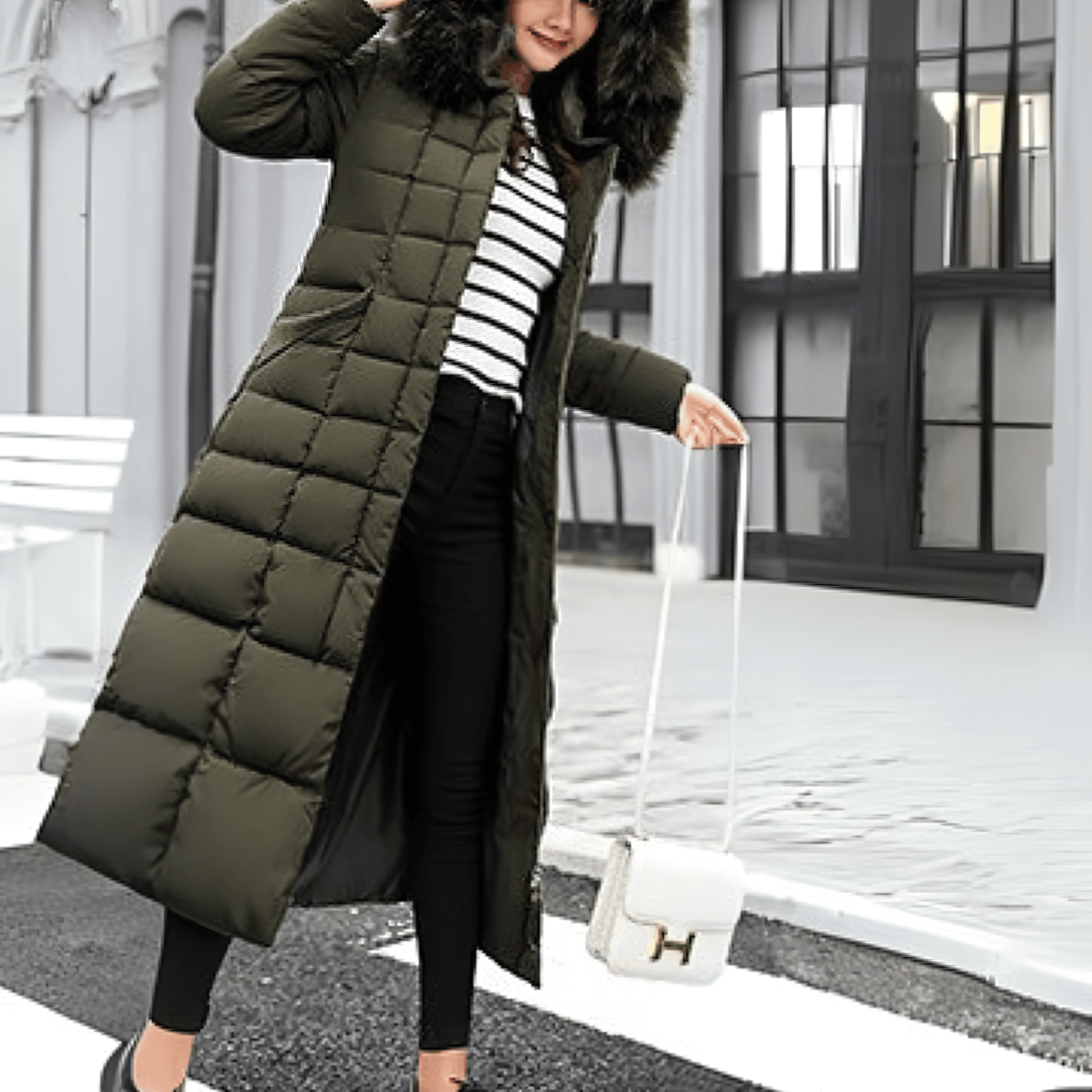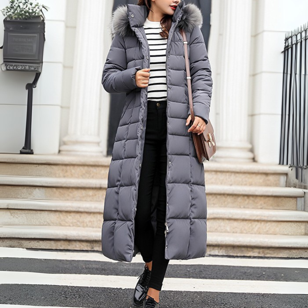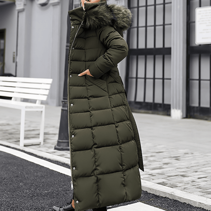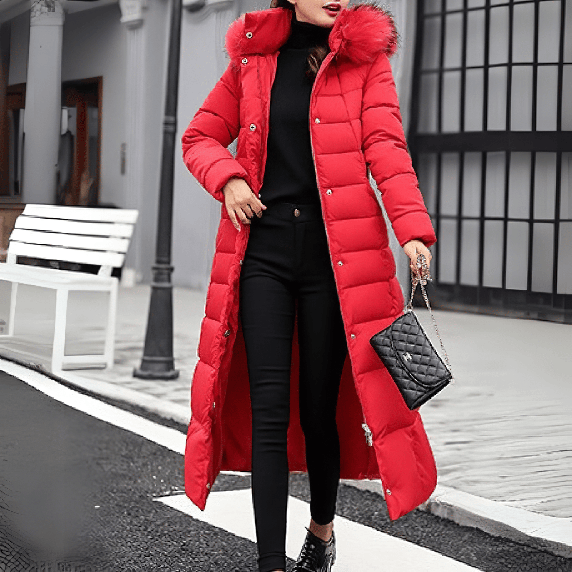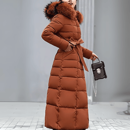 このロングダウンコートは、冬の寒さをしっかりと防ぎつつ、エレガントなシルエットを引き立てるデザインが特徴です。 ファーのトリムが付いたフードが暖かさと華やかさをプラスし、ウエスト部分のベルトがスタイルアップ効果を発揮します。