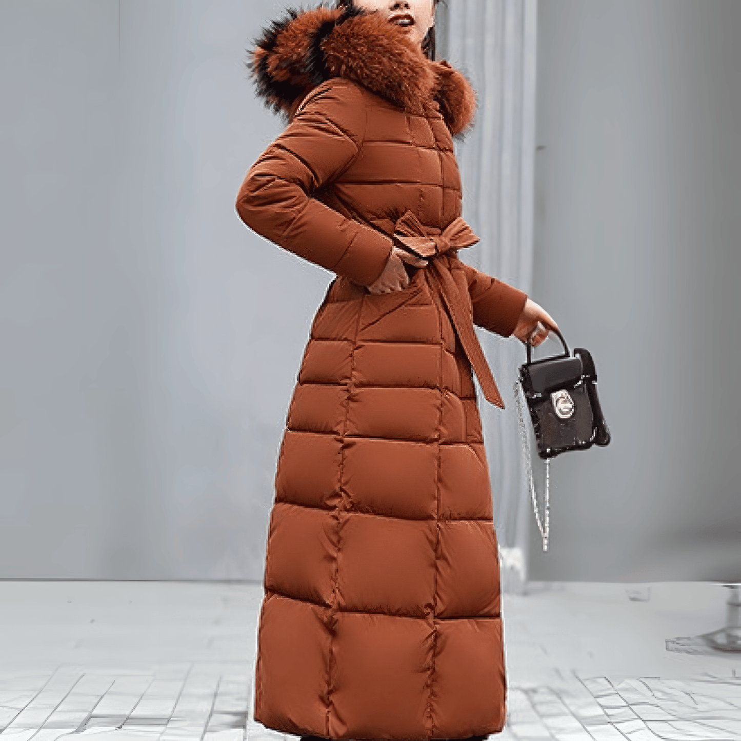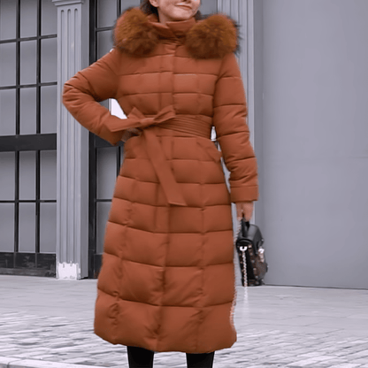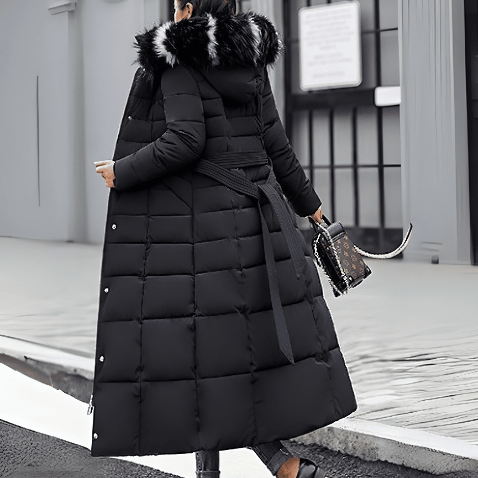ファー付きフードとベルトで暖かさとスタイルを両立