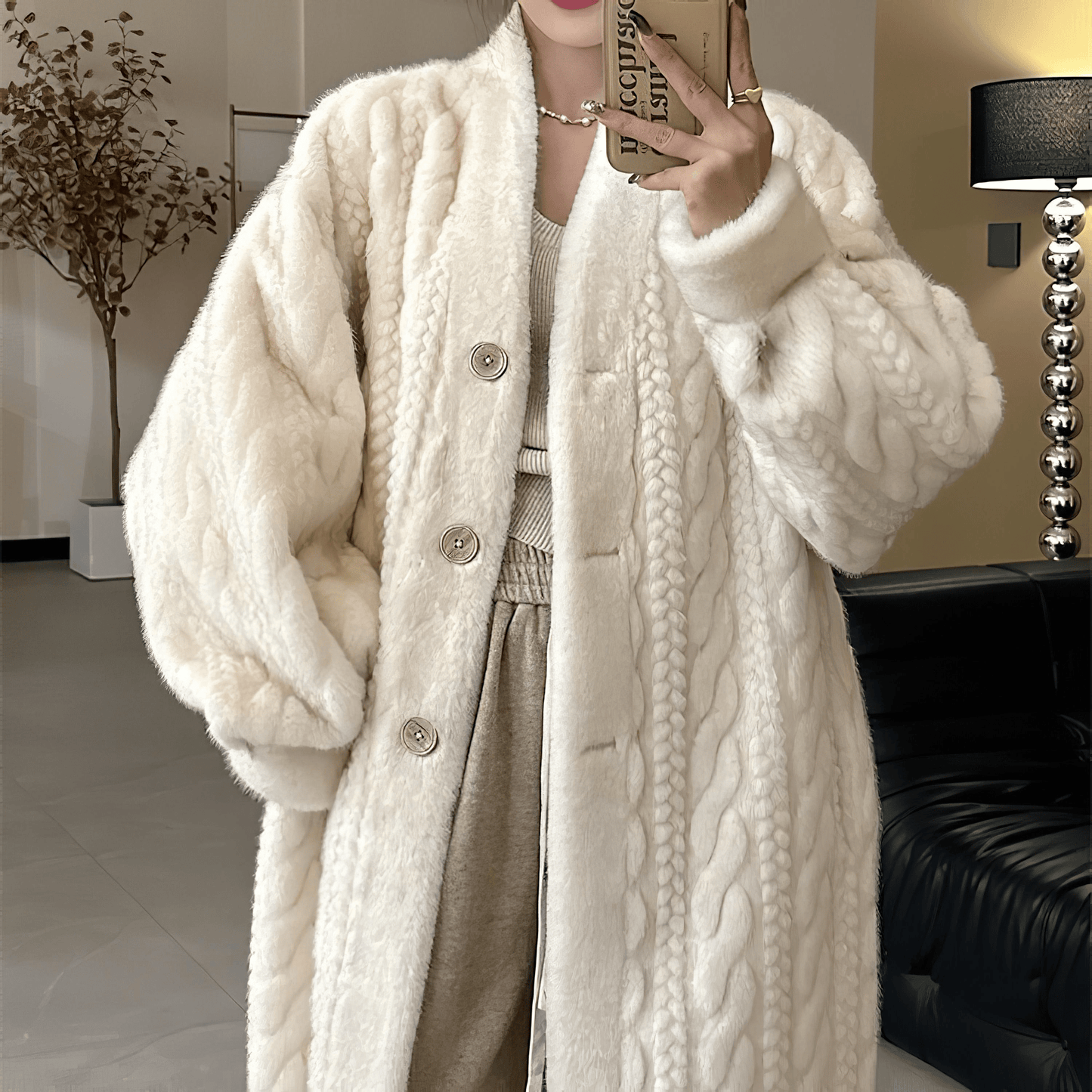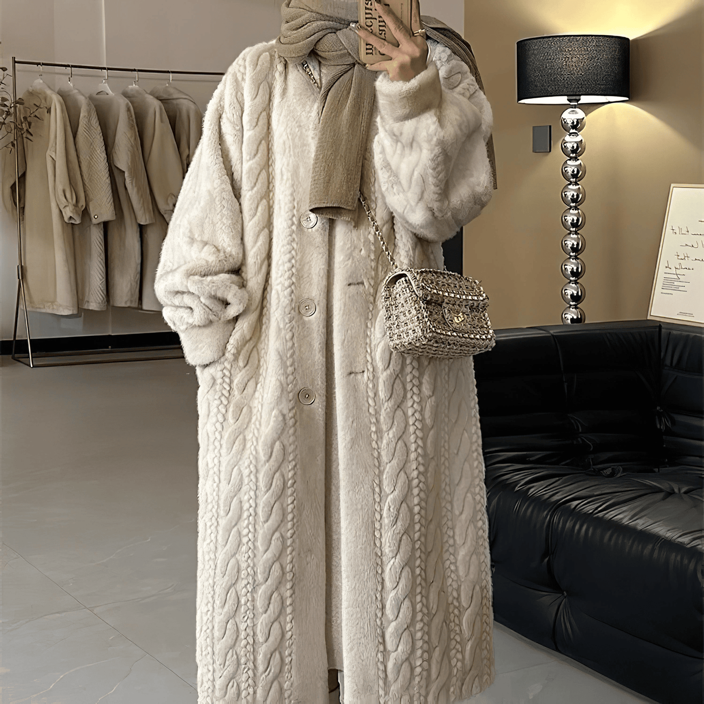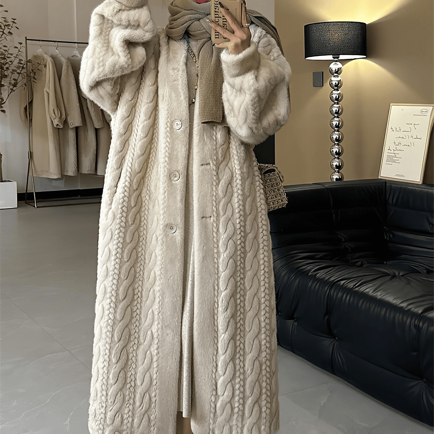 温かくスタイリッシュに過ごすためのロングコートが登場。全体に施されたクラシックなケーブル編み模様が、モダンでエレガントな雰囲気を演出します。 環境に配慮したエコファー素材を使用し、柔らかさと保温性を実現。柔らかなカラーが、洗練された印象を与え、様々なシーンで活躍します。 ゆったりとしたシルエットながらも大きめのボタンと絶妙なカットが、女性らしい美しさを引き立てます。