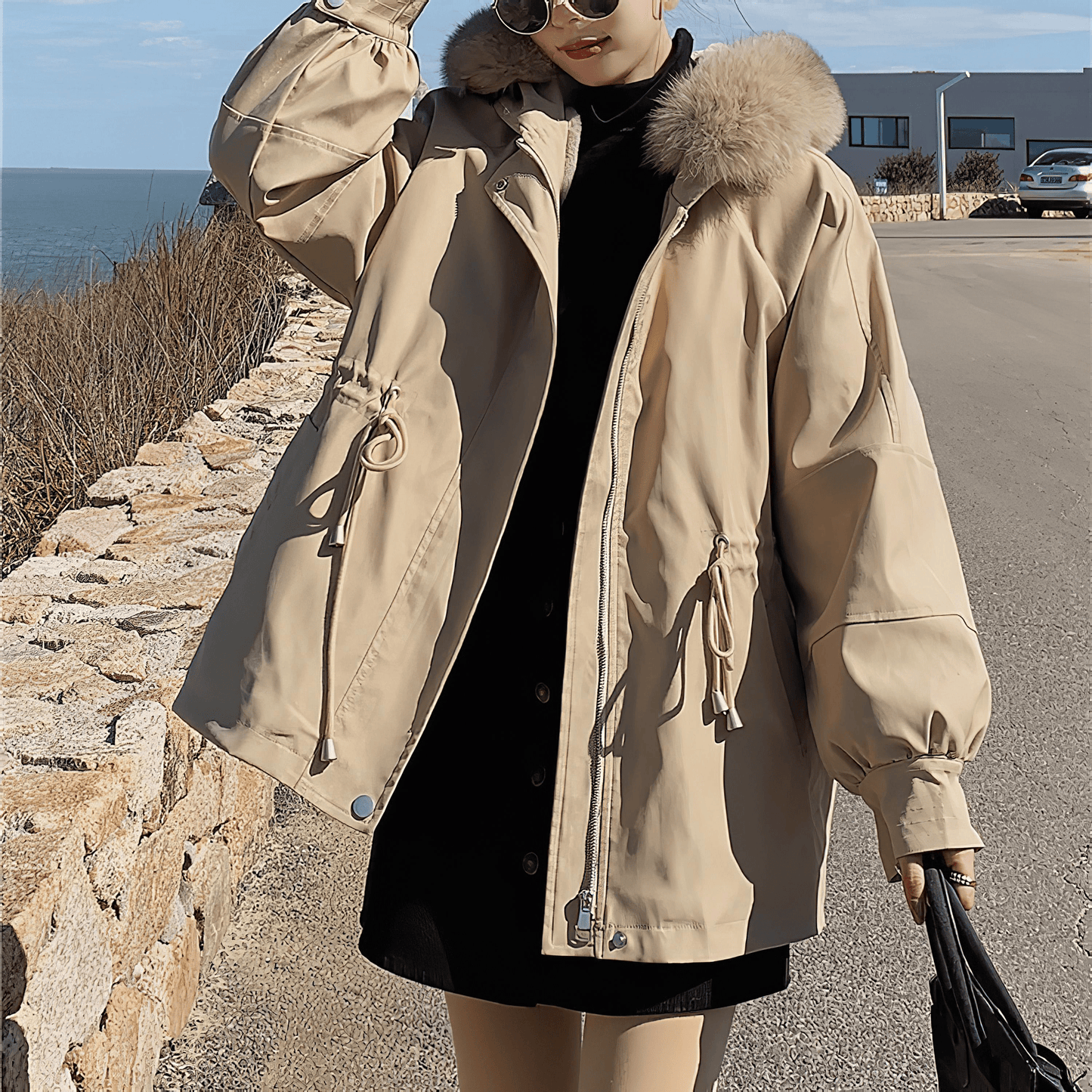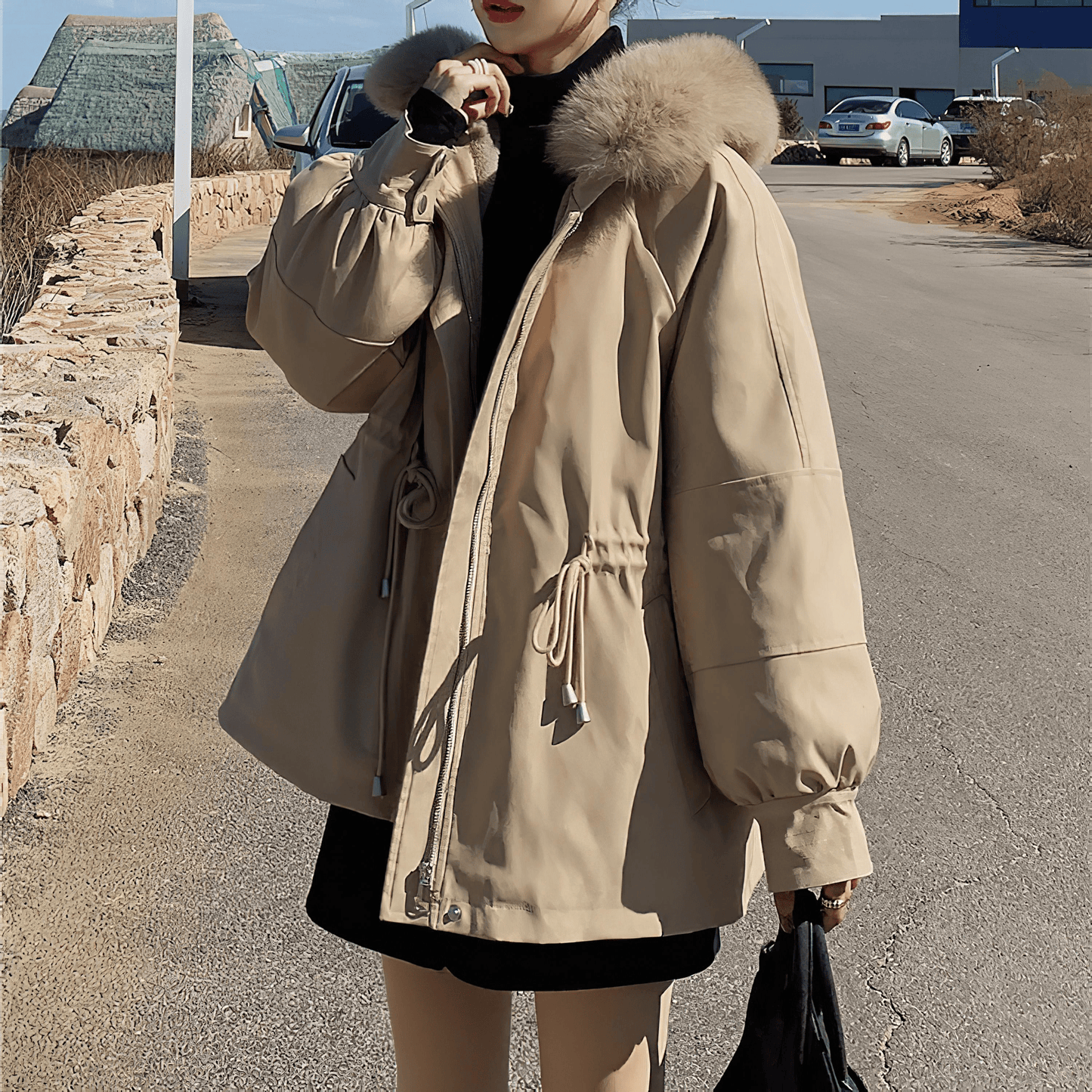 寒さの厳しい日にも快適に過ごせる設計で、フードには大きなファーを採用し上品さを引き立てます。ウエストのドローコードでシルエットを調整可能、スタイルアップ効果も抜群です。 カジュアルなシーンはもちろん、アウトドアや旅行にも活躍する機能的なデザイン。
