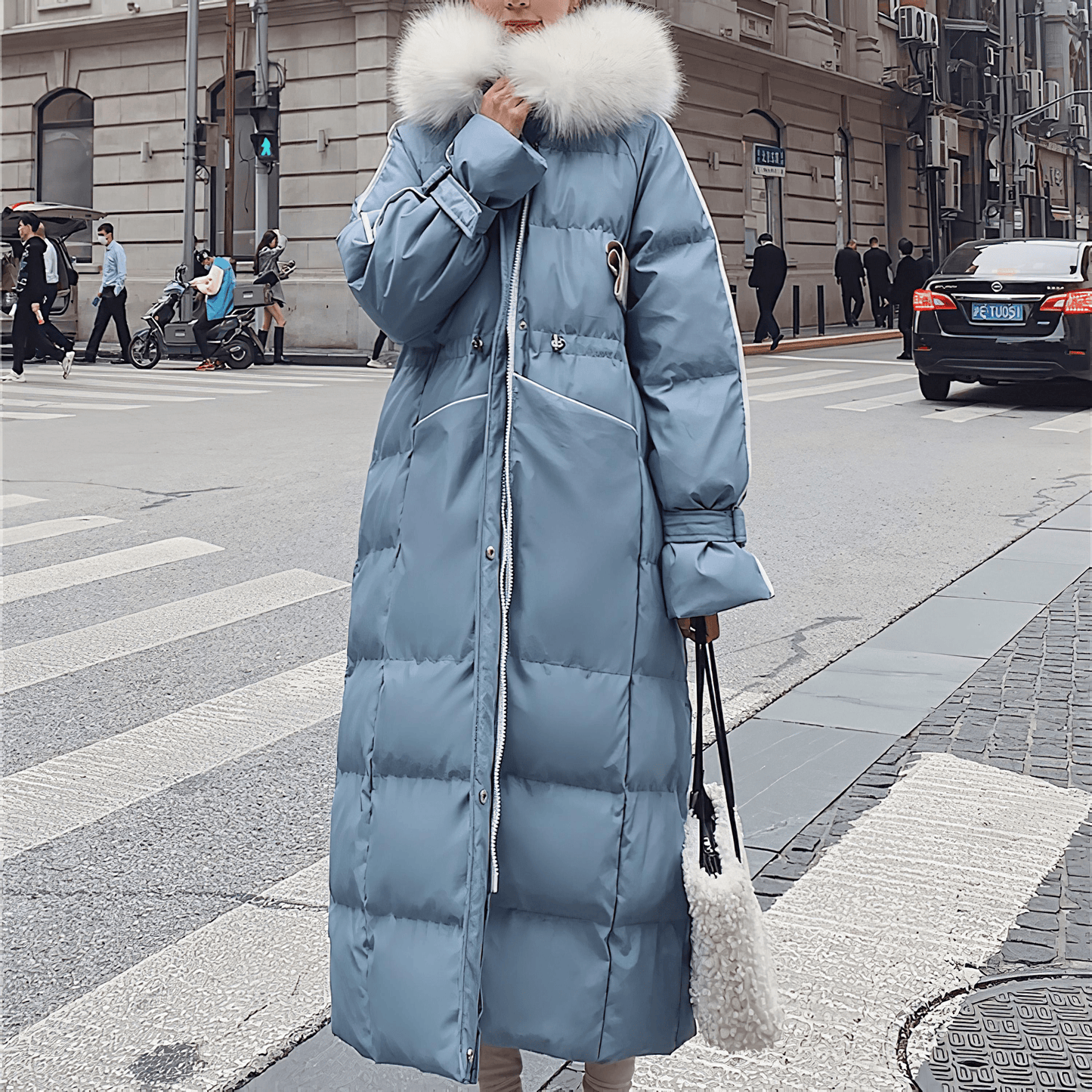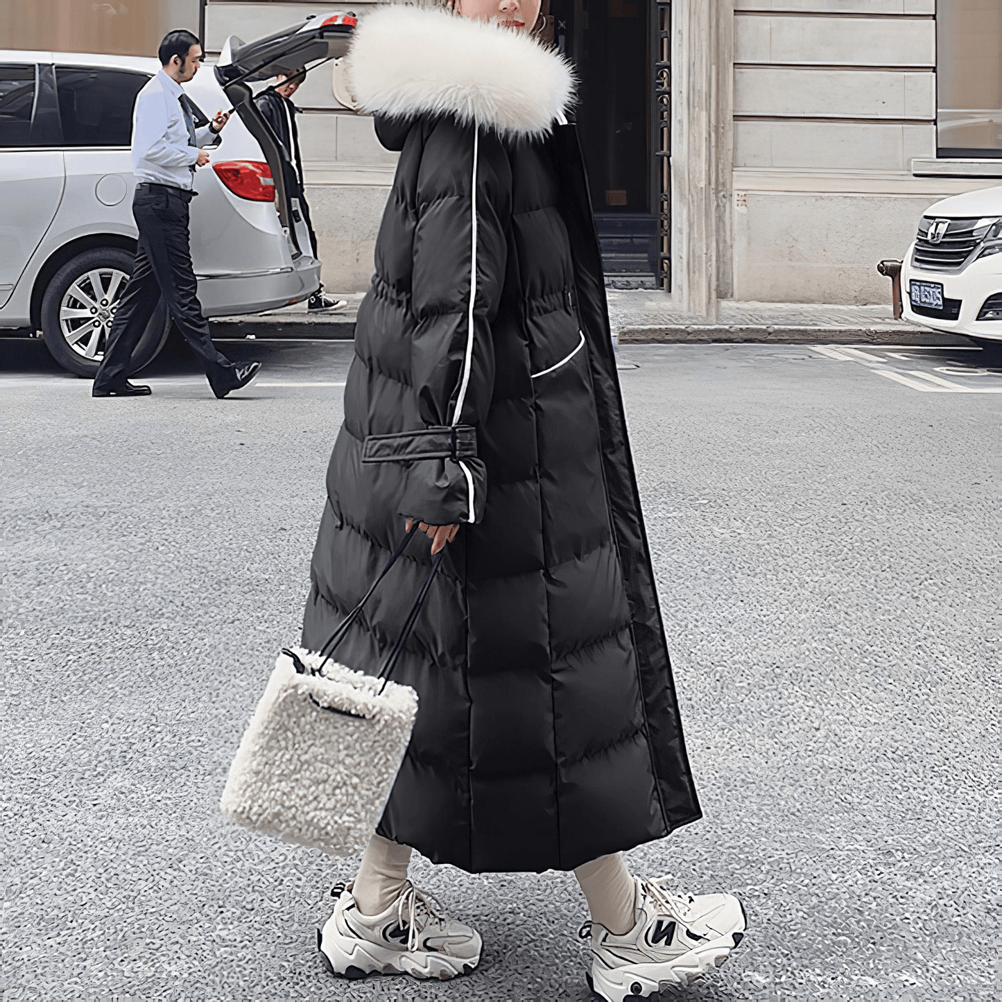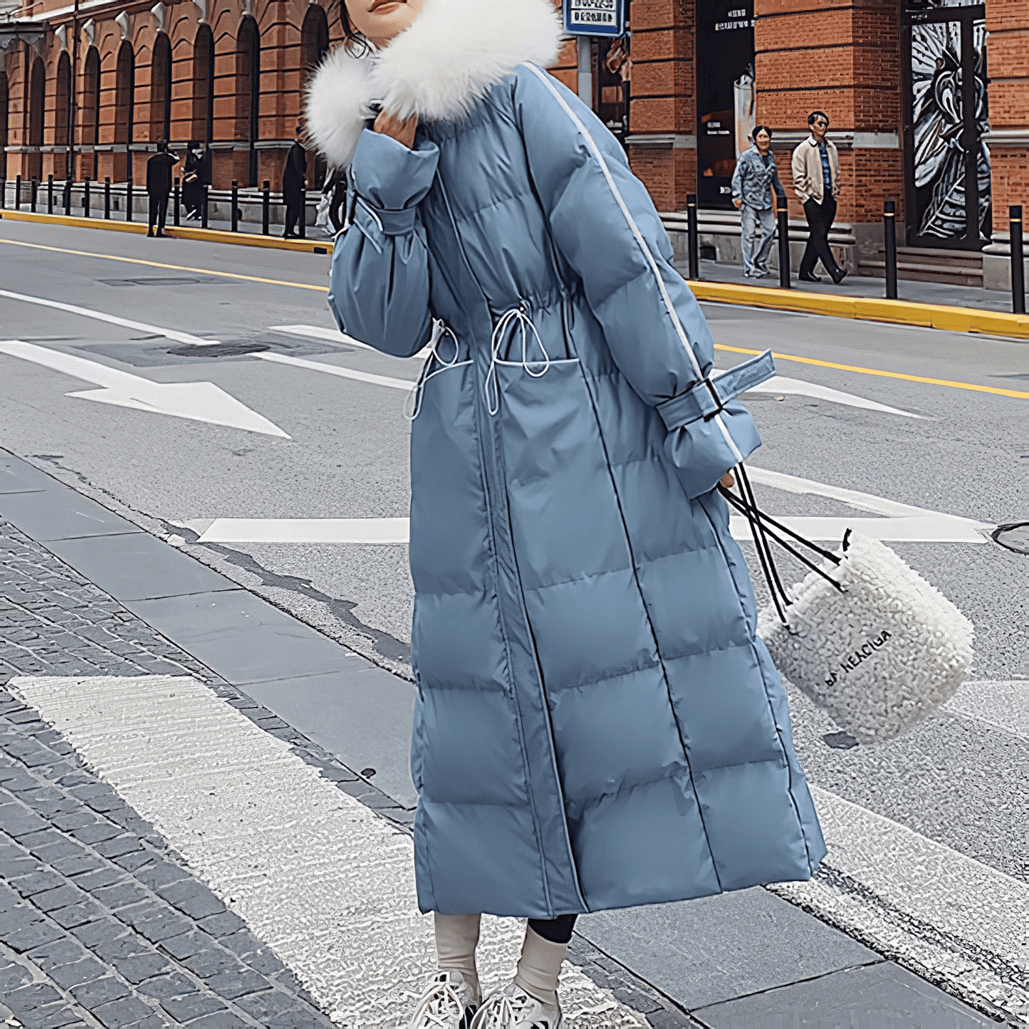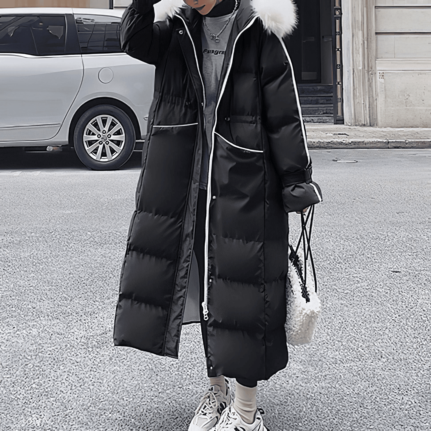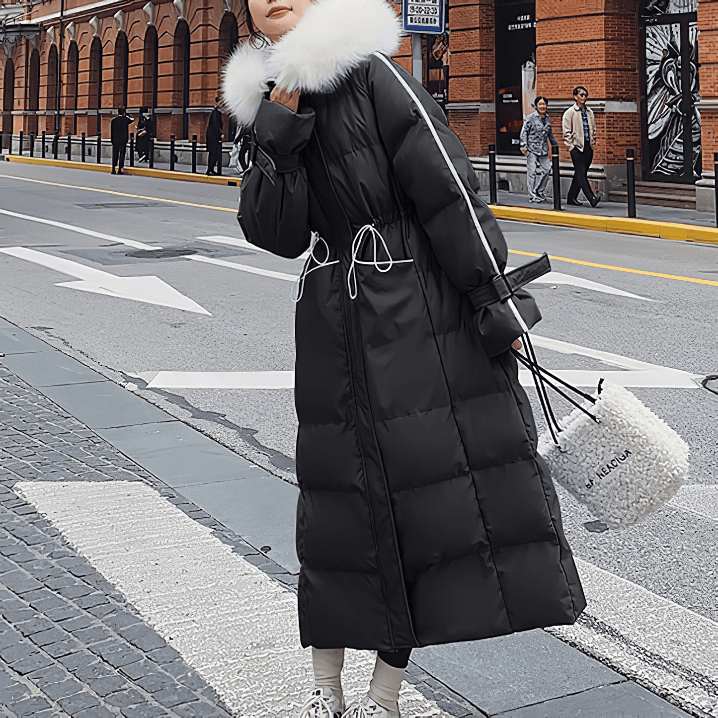 ブラックやブルーを基調としたシックなカラーに、ホワイトファーのフードがアクセントを添え、洗練されたスタイルを演出します。 ウエスト部分のドローコードでシルエットを自由に調整できるため、体型に合わせた美しいラインを楽しむことができます。