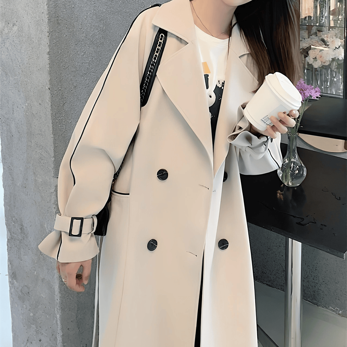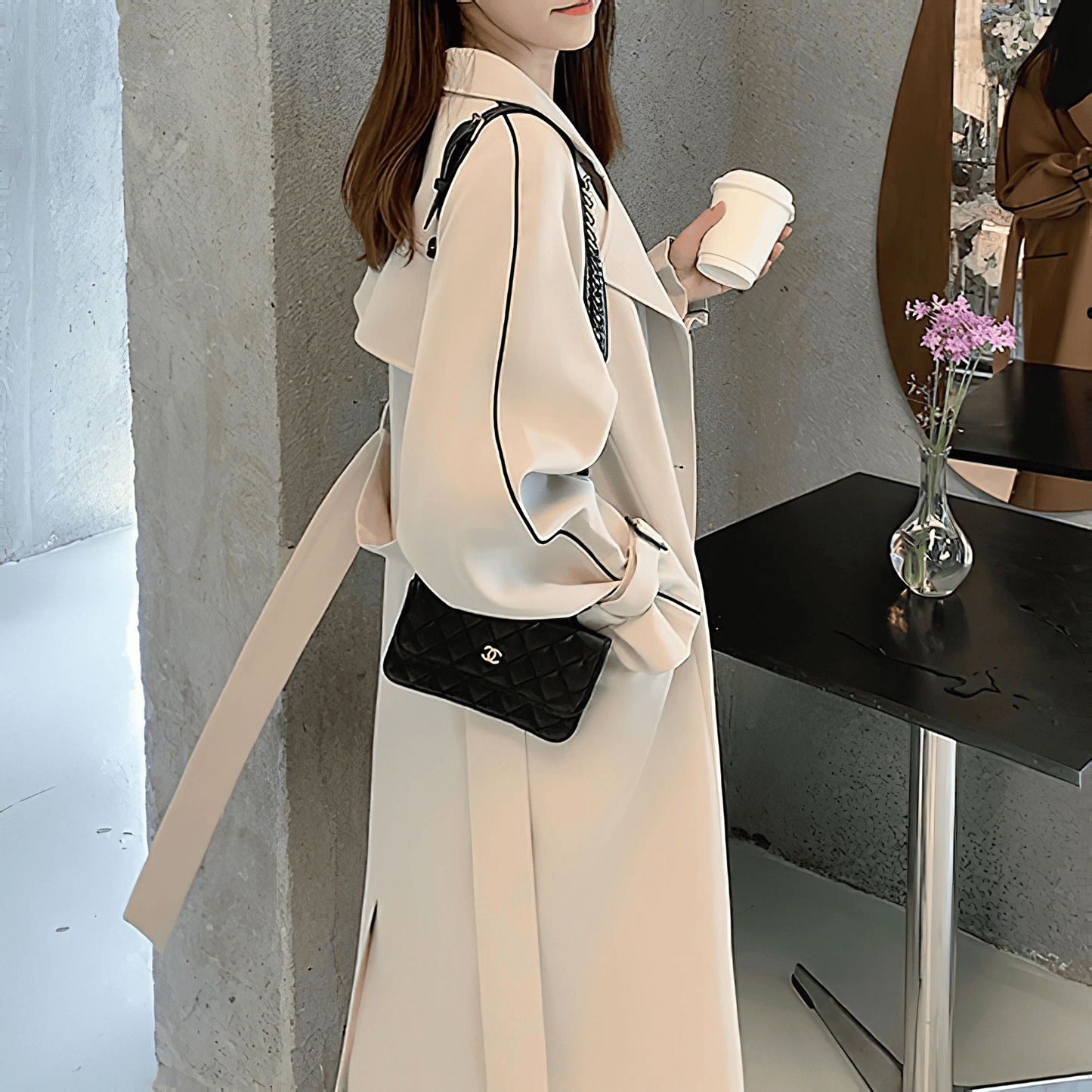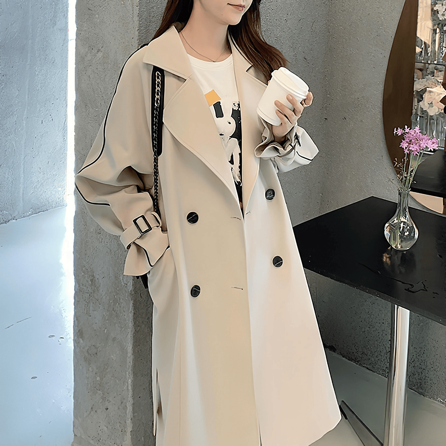 シンプルなベージュカラーにブラックパイピングがアクセントとして映え、シンプルながらも個性的な印象を与えます。 ダブルボタン仕様のクラシカルなデザインに加え、袖口のベルトが女性らしいシルエットを演出します。